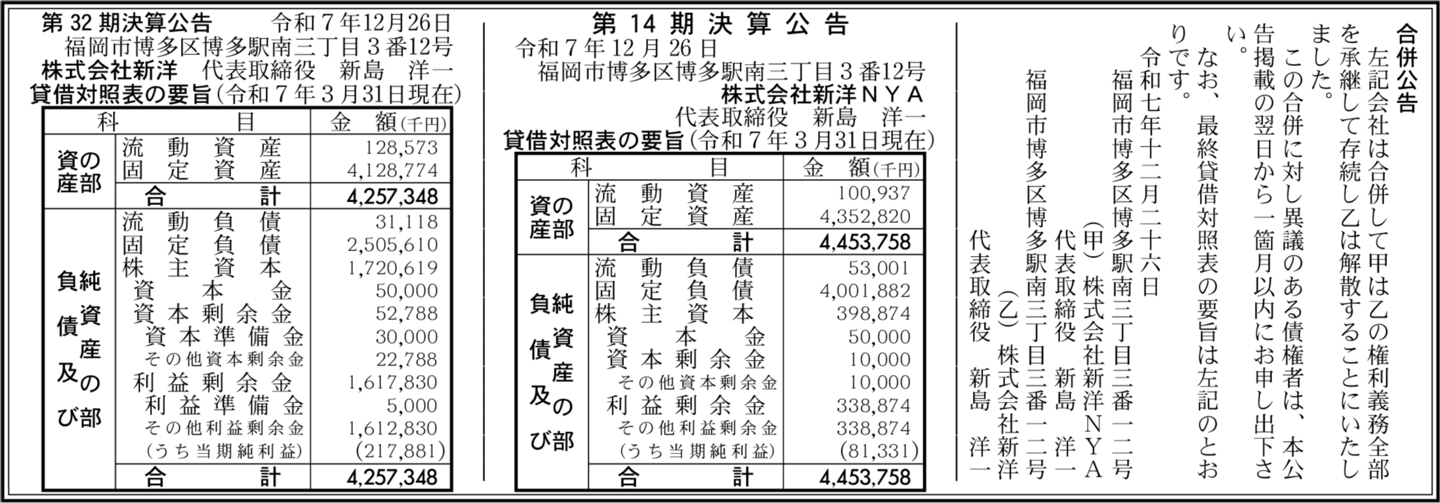 株式会社新洋NYA 福岡市博多区 【2025年3月期】 |