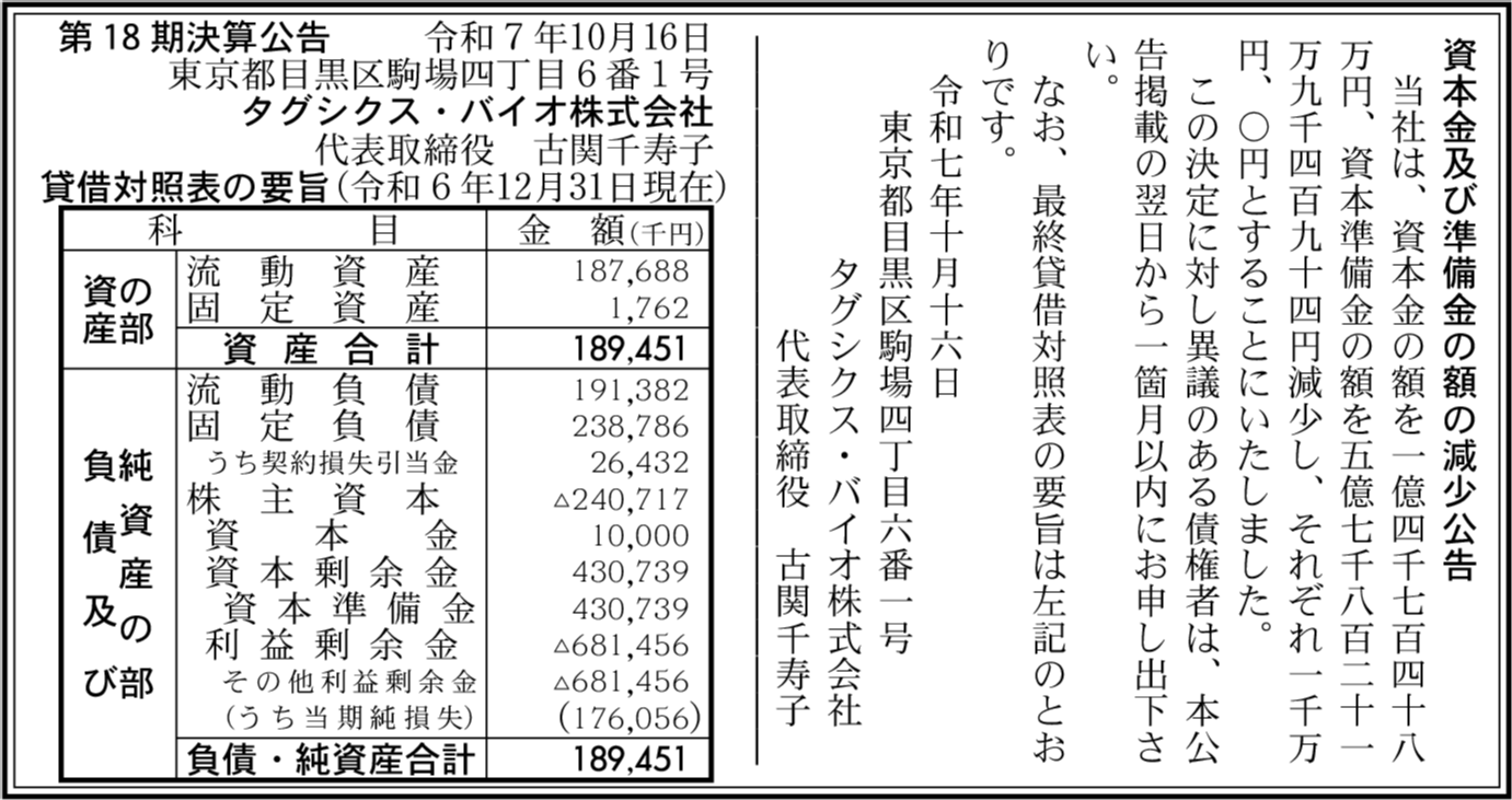 会社名 | タグシクス・バイオ株式会社 |