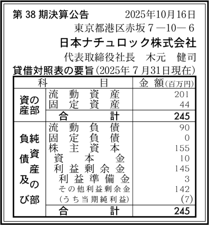 | 利益剰余金 | 1億4,500万円 (+5.07%) |