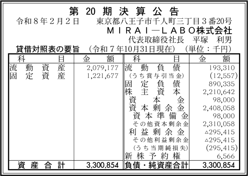 | 利益剰余金 | ▲2億9,541万5,000円 (赤字拡大) |