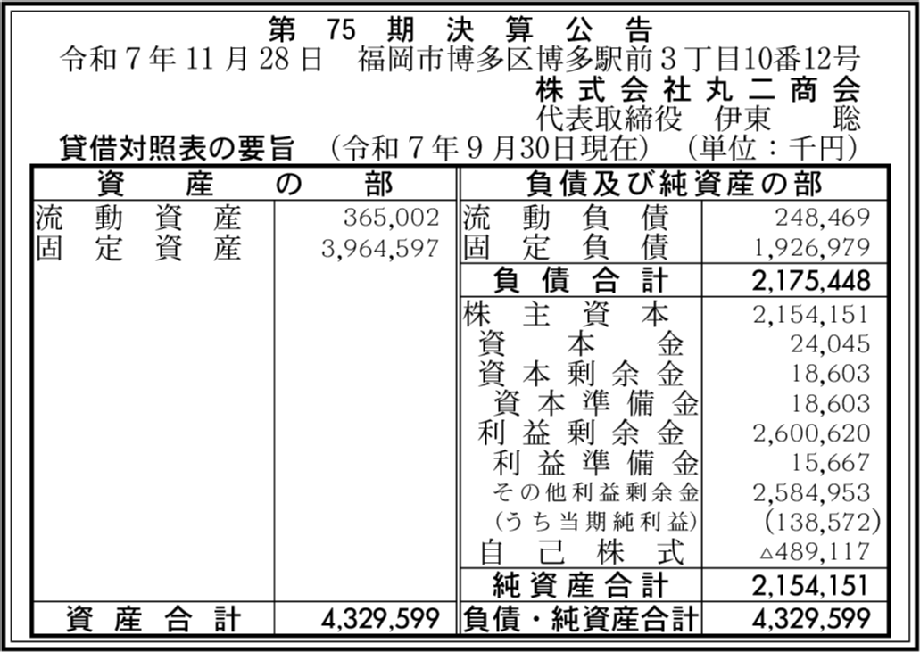 | 総資産 | 43億2,959万9,000円 (▲4.15%) |