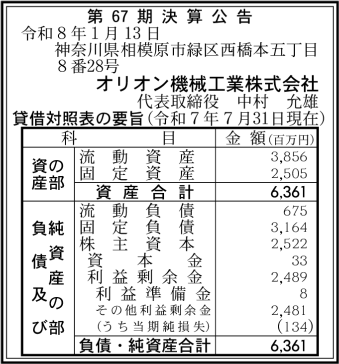 オリオン産機株式会社 東京都府中市 【2025年1月期】 |