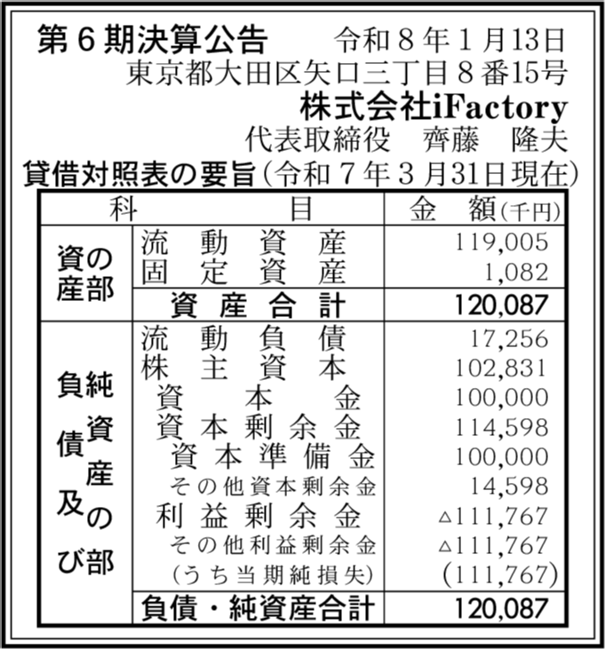 | 利益剰余金 | ▲1億1,176万7,000円 (赤字拡大) |