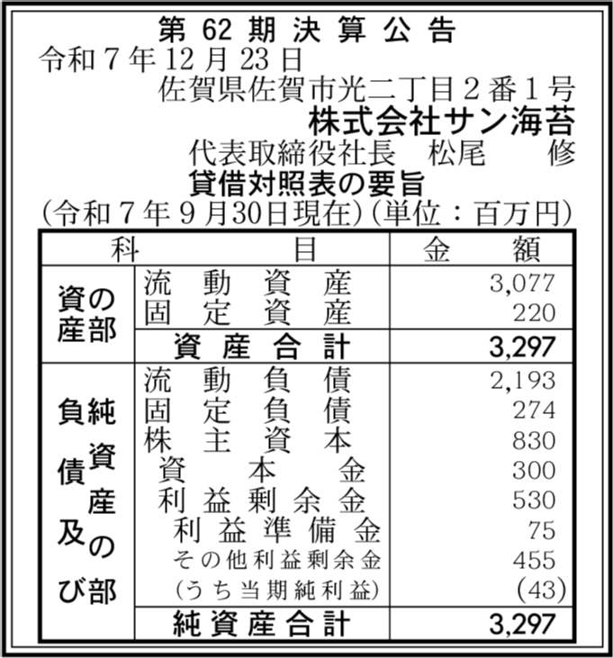 佐賀海苔株式会社 佐賀県佐賀市 【2025年9月期】 |