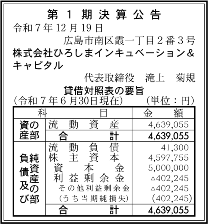 | 会社名 | 株式会社ひろしまインキュベーション&キャピタル |