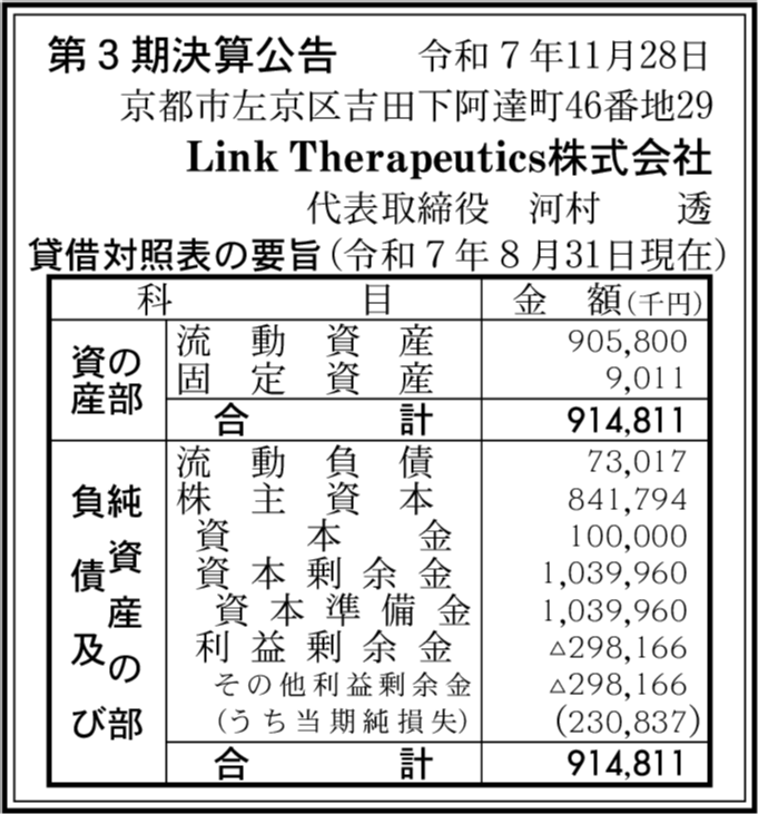 株式会社aceRNA Technologies 京都市左京区 【2025年2月期】 |