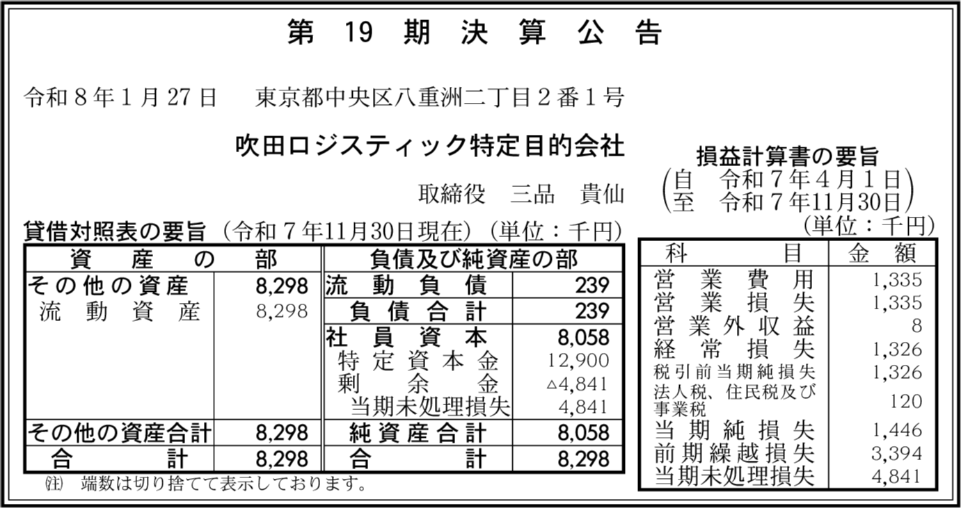 厚木ロジスティック特定目的会社 東京都中央区 【2025年6月期】 |