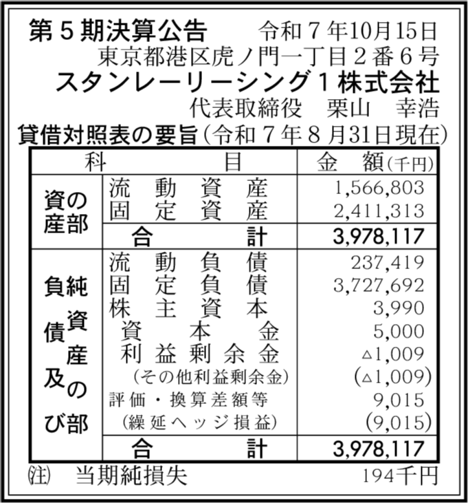 タタンリーシング1株式会社 東京都港区 【2025年8月期】 |