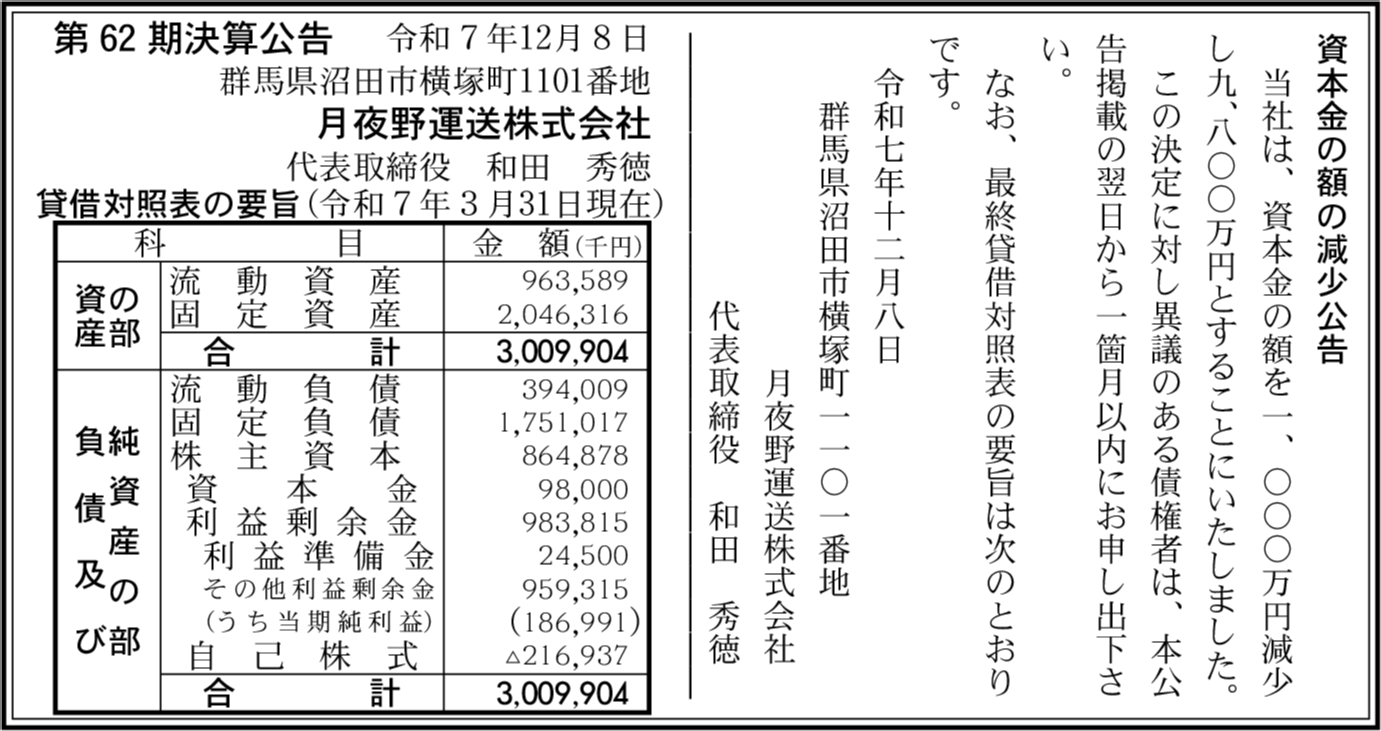 | 新潟丸善運輸株式会社 | 新潟県上越市 | ▲2,325万7,000円 |