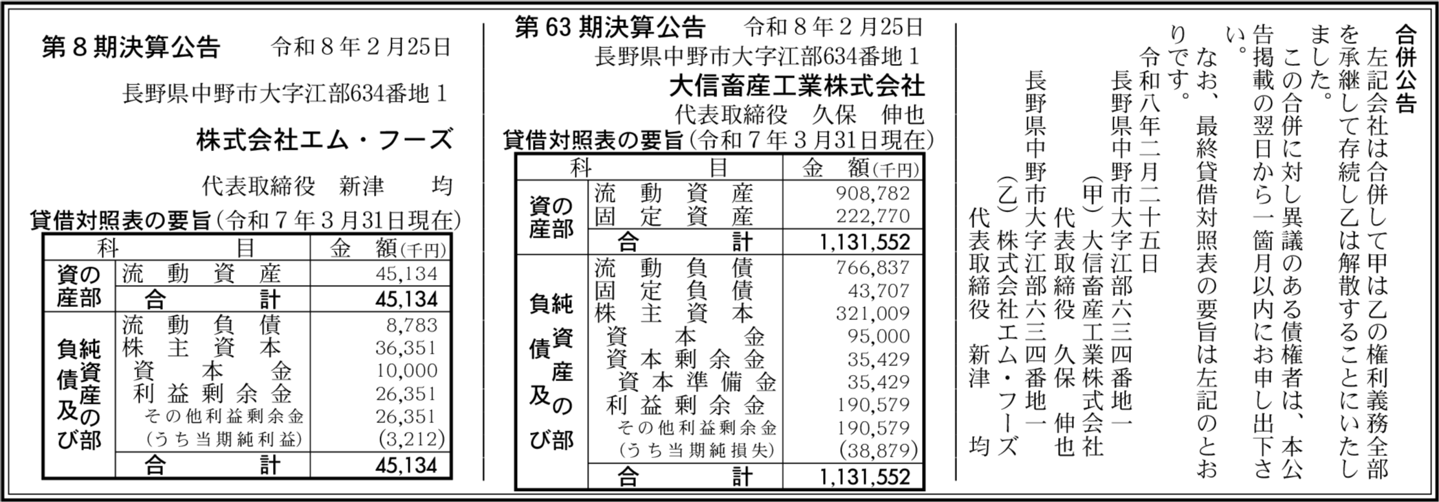大信畜産工業株式会社 長野県中野市 【2025年3月期】 |