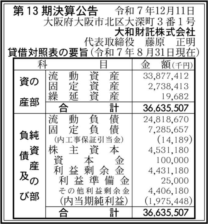 大和財託レジデンシャル株式会社 大阪府大阪市北区 【2024年8月期】 |