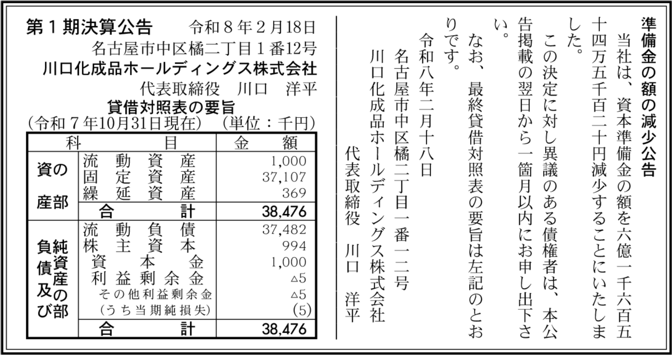 | 会社名 | 川口化成品ホールディングス株式会社 |