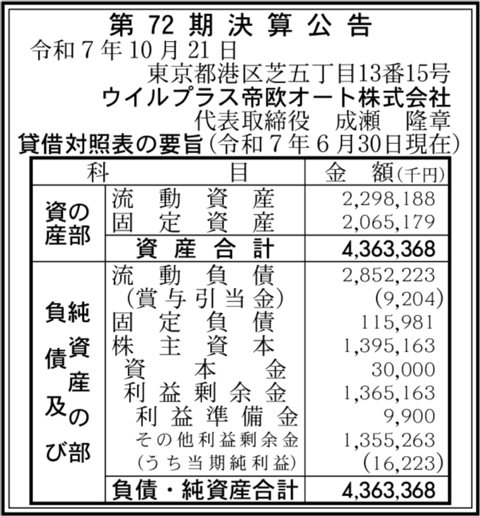 ウイルプラスモトーレン株式会社 東京都港区 【2025年6月期】 |