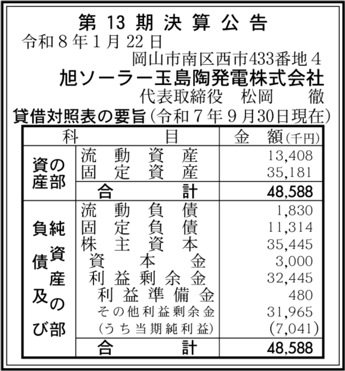 旭ソーラー美作北山発電株式会社 岡山市南区 【2025年9月期】 |