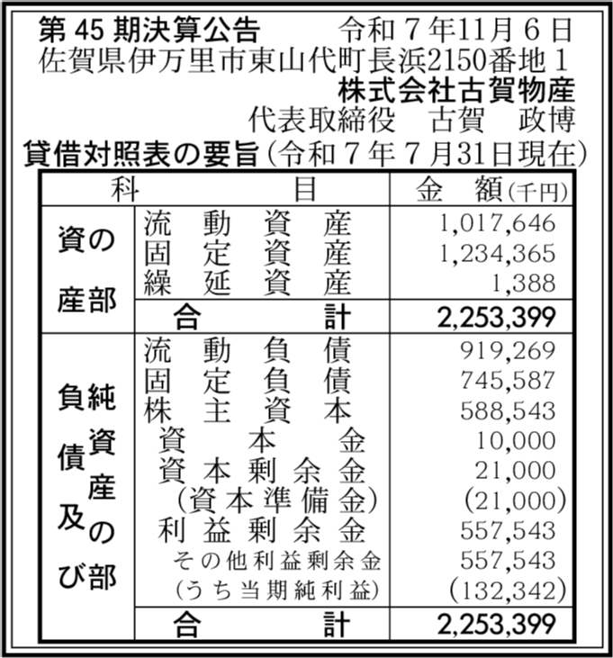 株式会社古賀建設 佐賀県伊万里市 【2024年5月期】 |