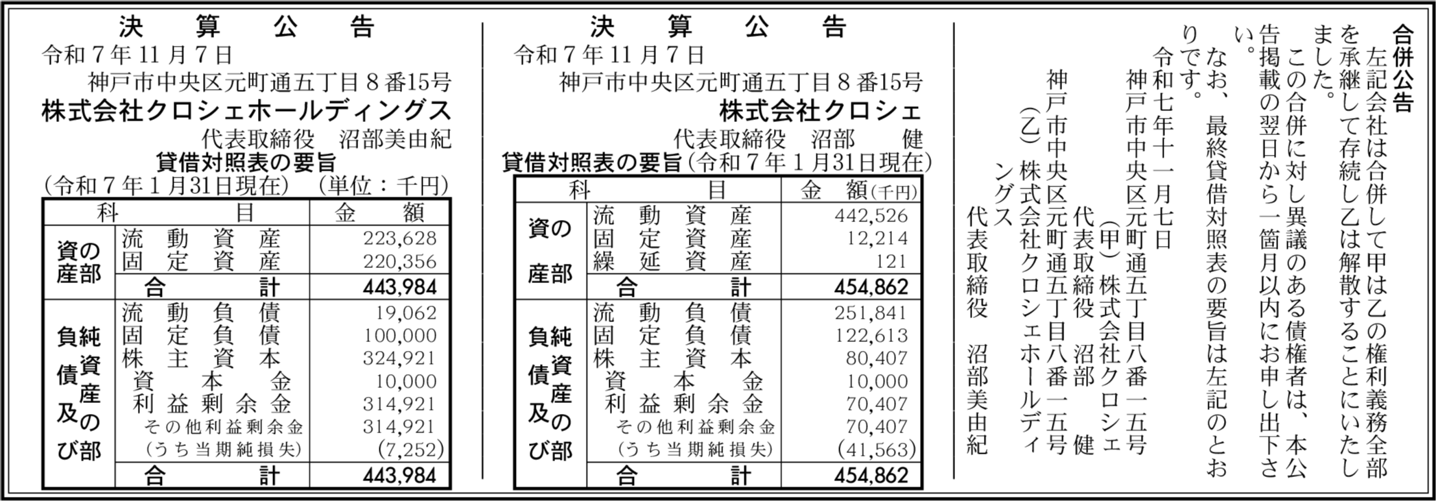 株式会社クロシェホールディングス 神戸市中央区 【2025年1月期】 |
