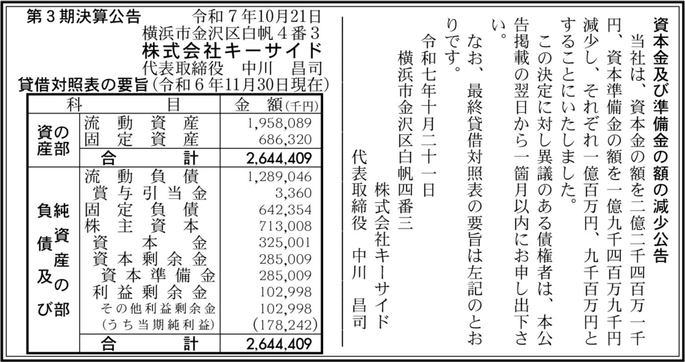 株式会社キーサイド閉鎖済み 横浜市金沢区 【2022年11月期】 |
