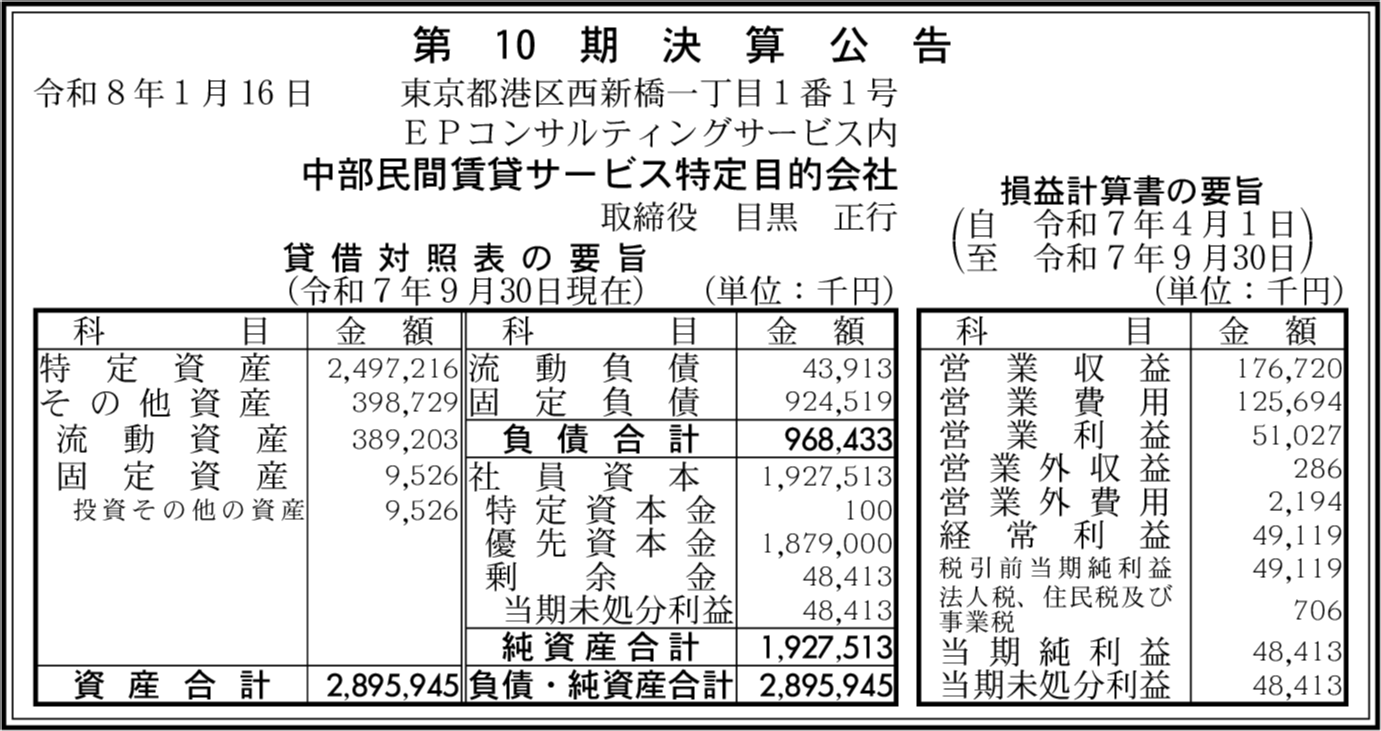 | 会社名 | 中部民間賃貸サービス特定目的会社 |