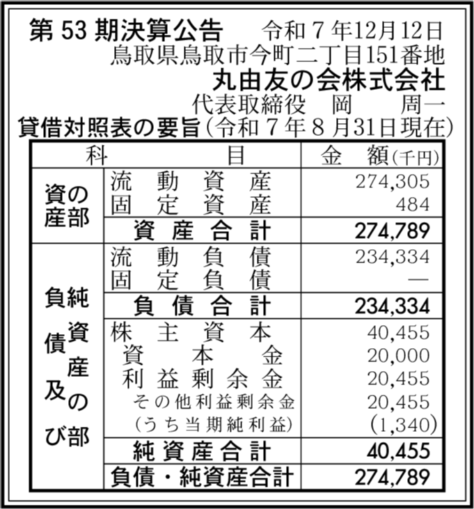 株式会社丸由 鳥取県鳥取市 【2024年8月期】 |