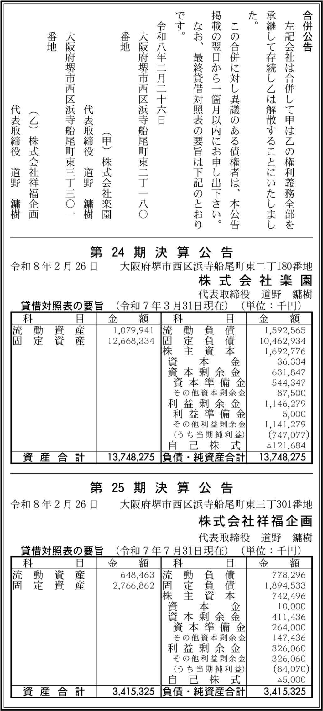 株式会社祥福企画 大阪府堺市西区 【2025年7月期】 |