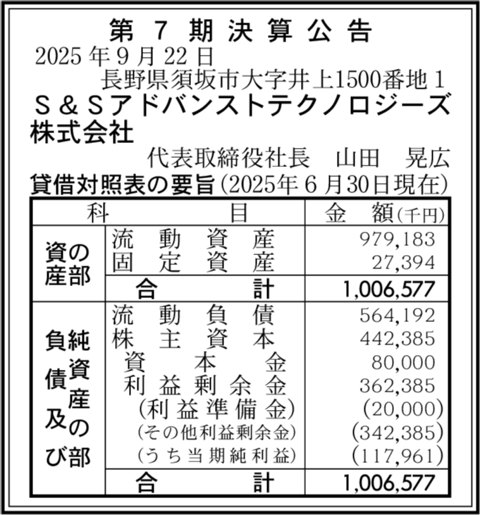 S&Sコンポーネンツ株式会社 長野県須坂市 【2025年6月期】 |