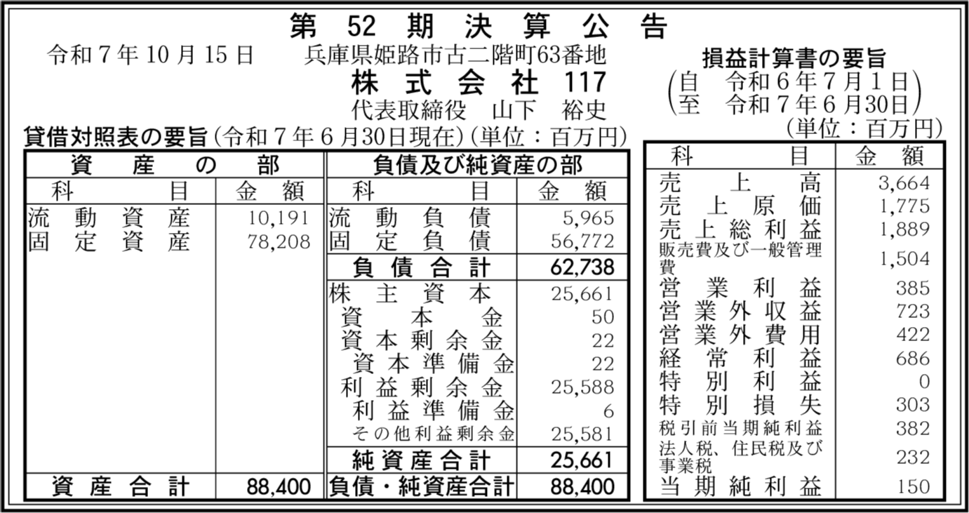 株式会社117メンバーズ 兵庫県姫路市 【2025年6月期】 |