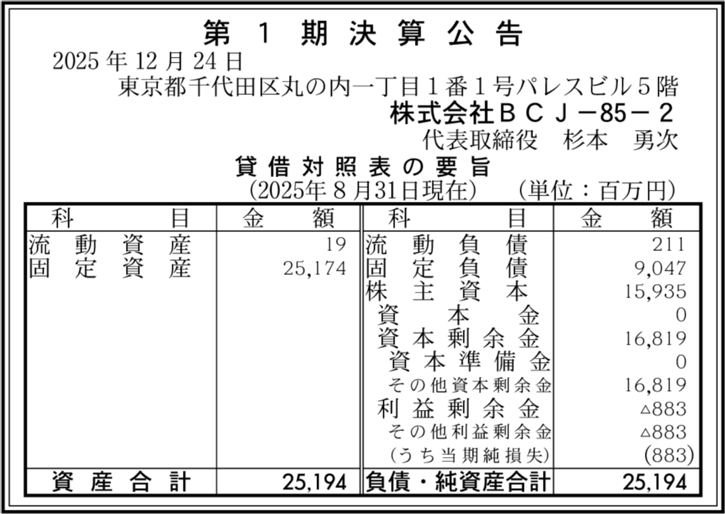 株式会社BCJ‐85‐1 東京都千代田区 【2025年8月期】 |