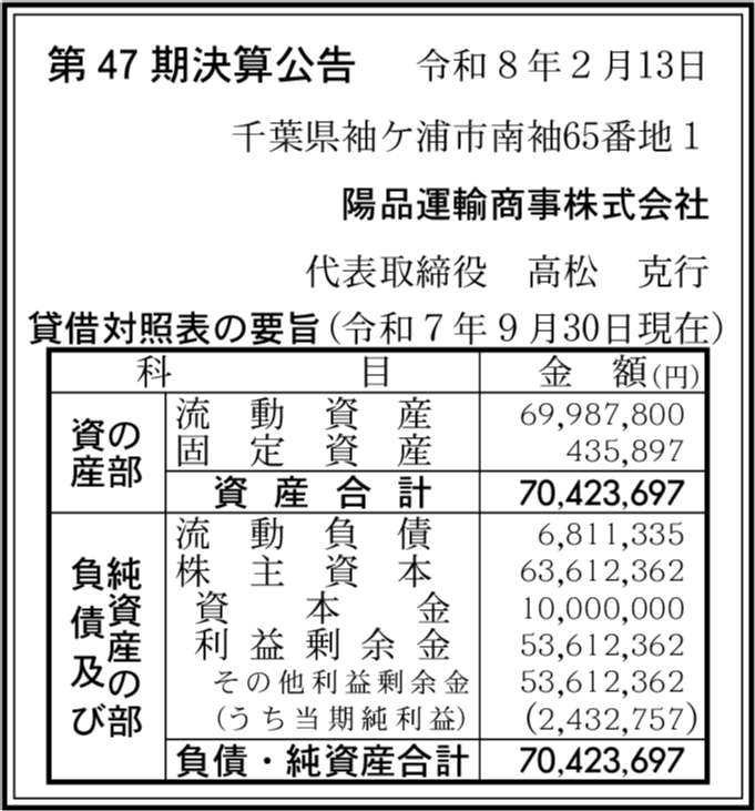 陽品運輸倉庫株式会社 千葉県市原市 【2025年9月期】 |
