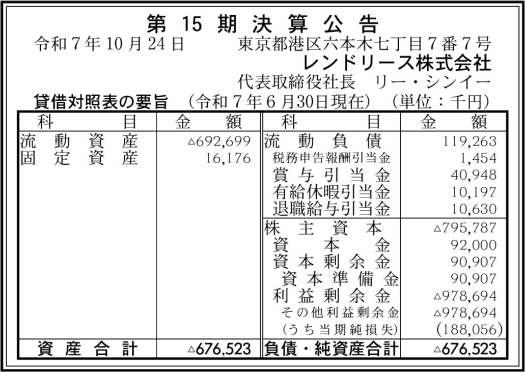 レンドリース・ジャパン株式会社 東京都港区 【2025年6月期】 |