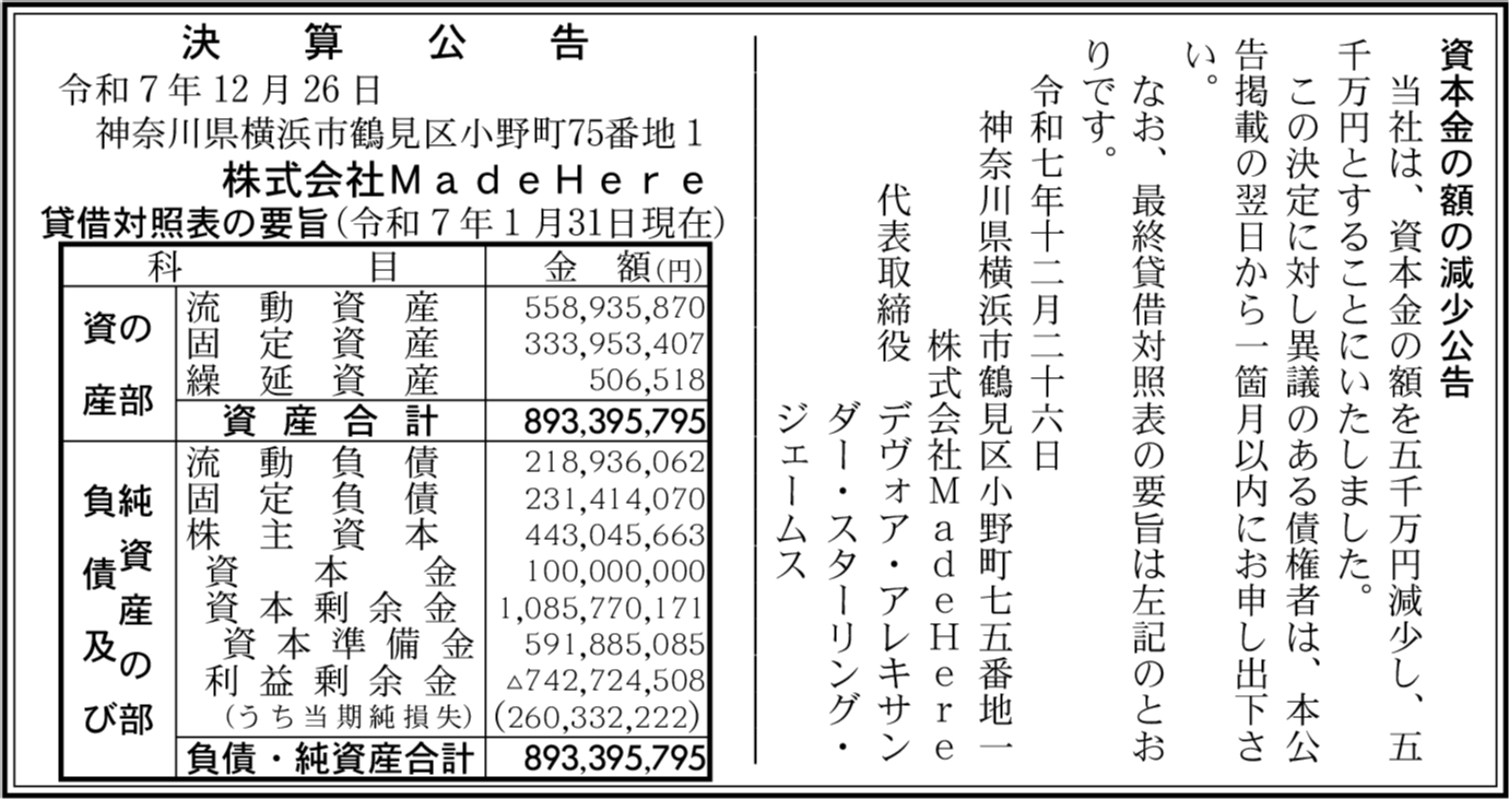 | 利益剰余金 | ▲7億4,272万4,508円 (赤字拡大) |