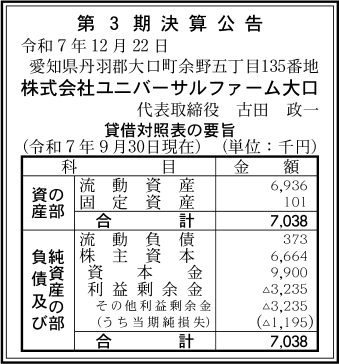 | 会社名 | 株式会社ユニバーサルファーム大口 |