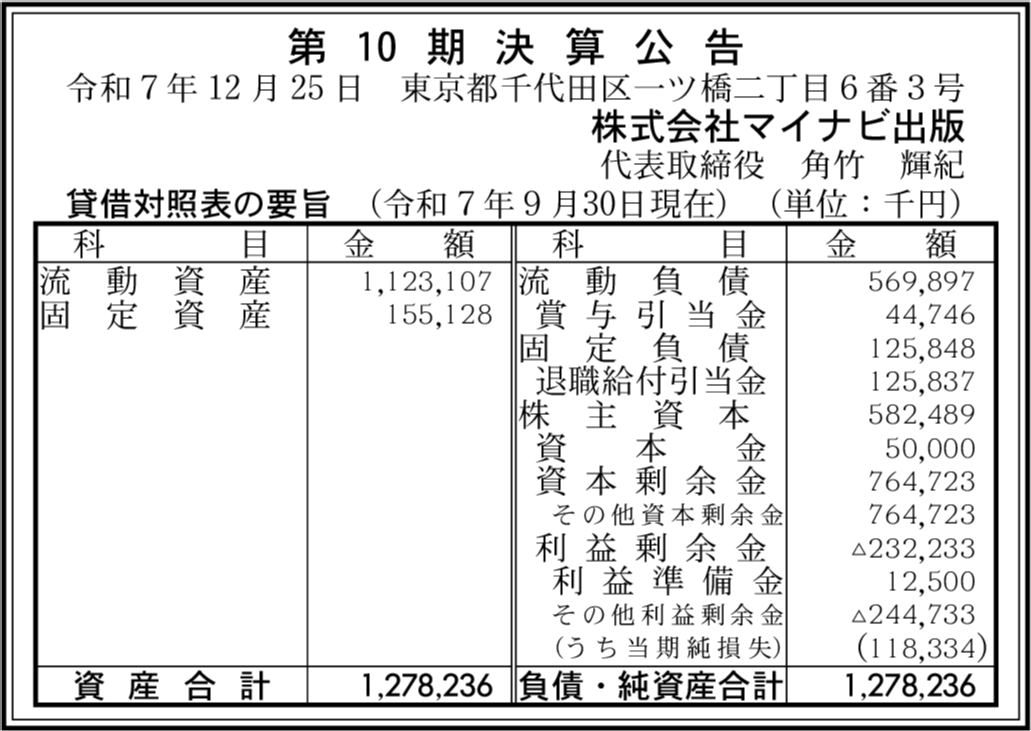 | 株式会社マイナビ文化事業社 | 東京都千代田区 | ▲3,662万8,000円 (赤字拡大) |