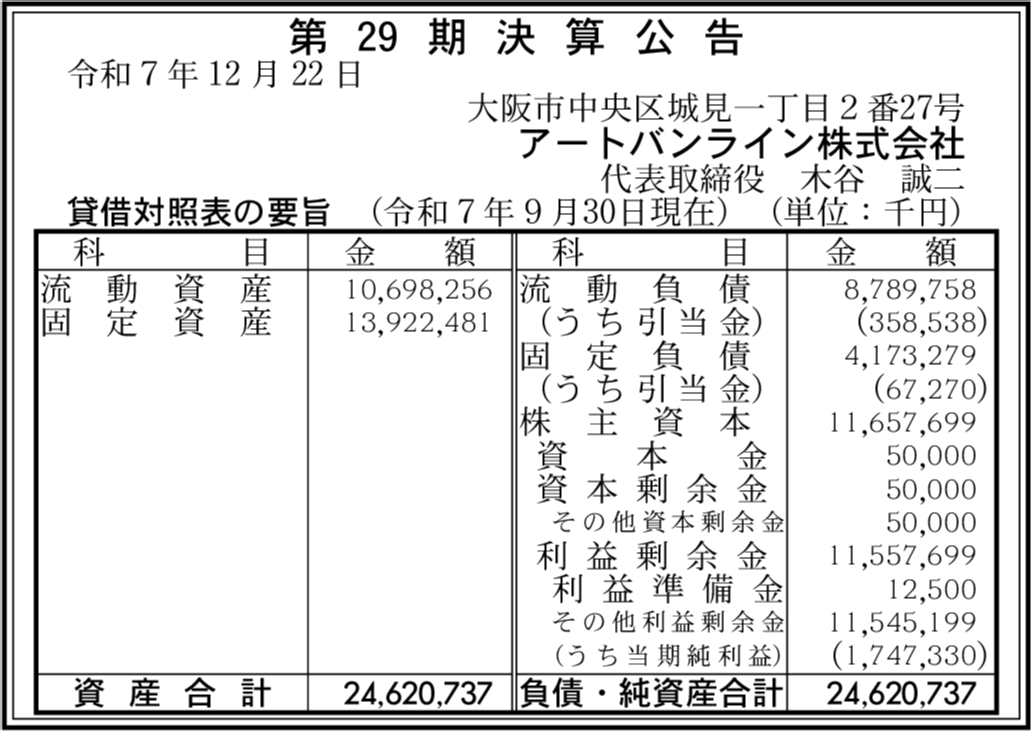 アートプラス株式会社 大阪市中央区 【2025年9月期】 |