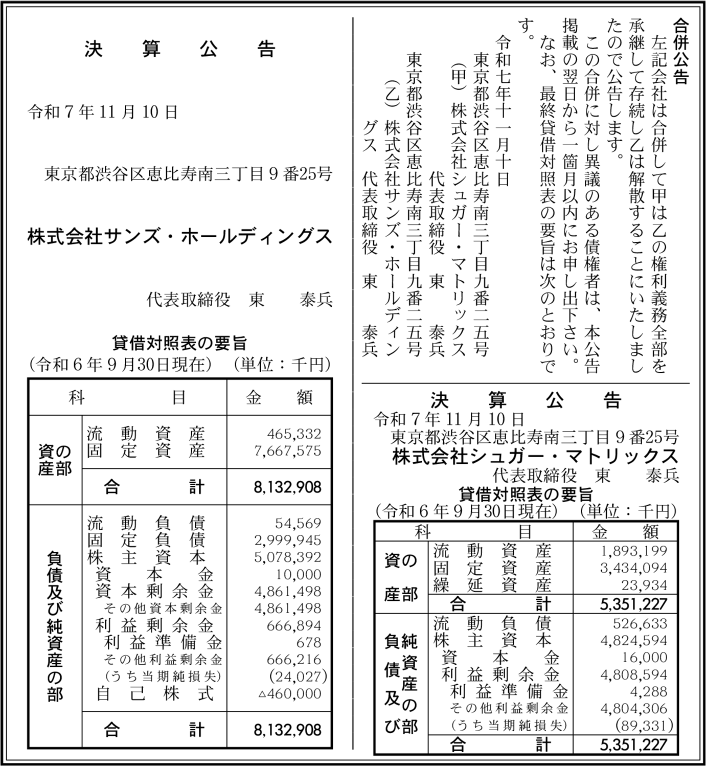 株式会社サンズ・ホールディングス 東京都渋谷区 【2024年9月期】 |