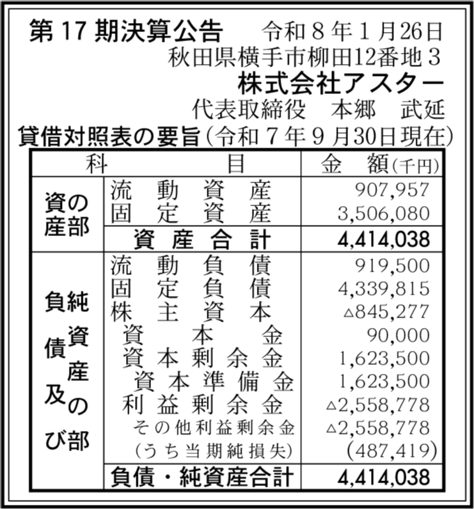 | 利益剰余金 | ▲25億5,877万8,000円 (赤字拡大) |