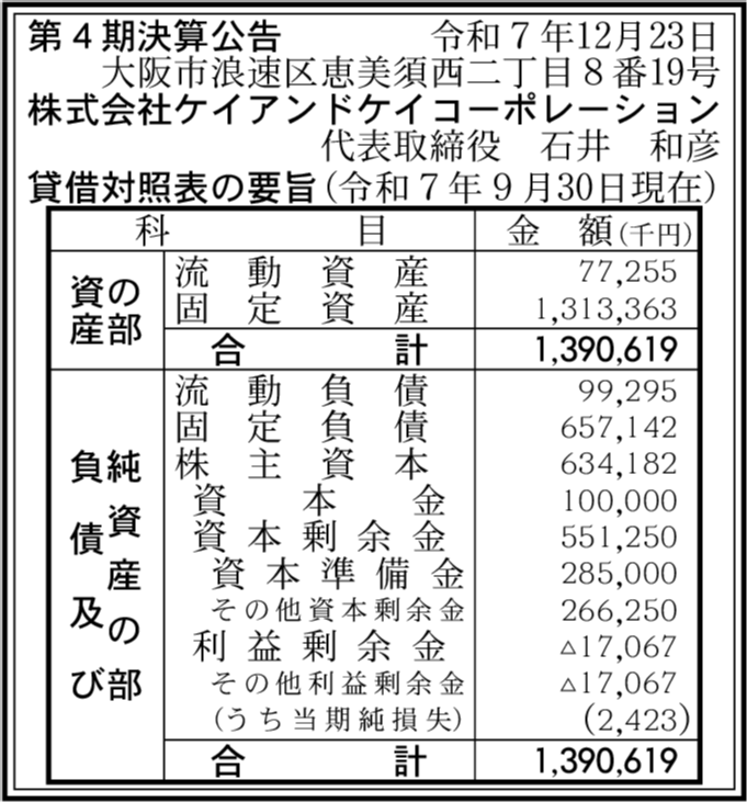株式会社ケイアンドケイコーポレーション閉鎖済み 大阪市浪速区 【2022年9月期】 |
