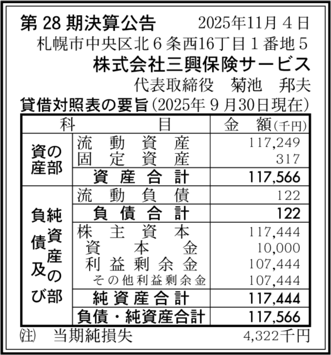 | 利益剰余金 | 1億744万4,000円 (▲19.46%) |