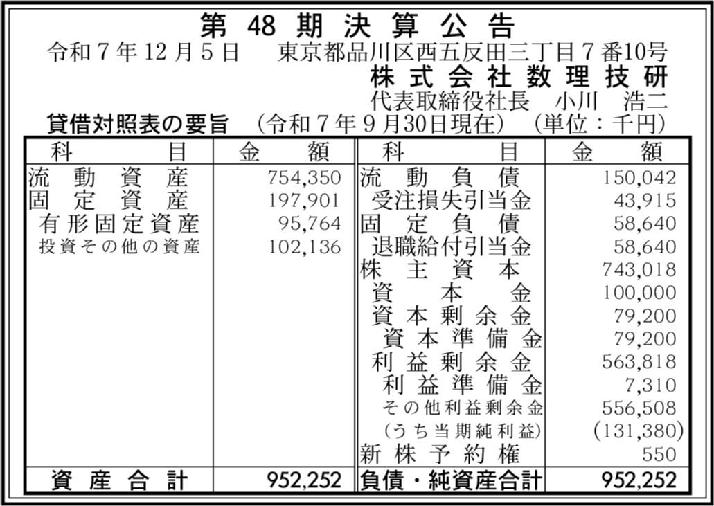 | 株式会社数理ホールディングス | 東京都千代田区 | ▲3億1,347万7,000円 |