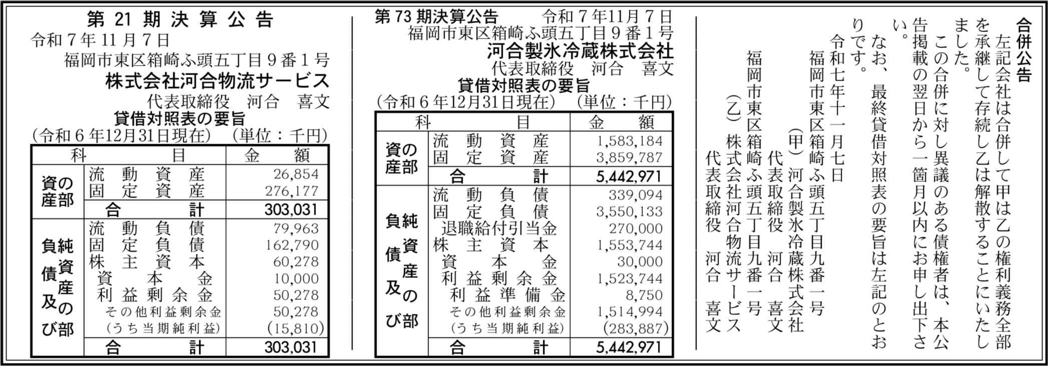 河合製氷冷蔵株式会社 福岡市東区 【2024年12月期】 |