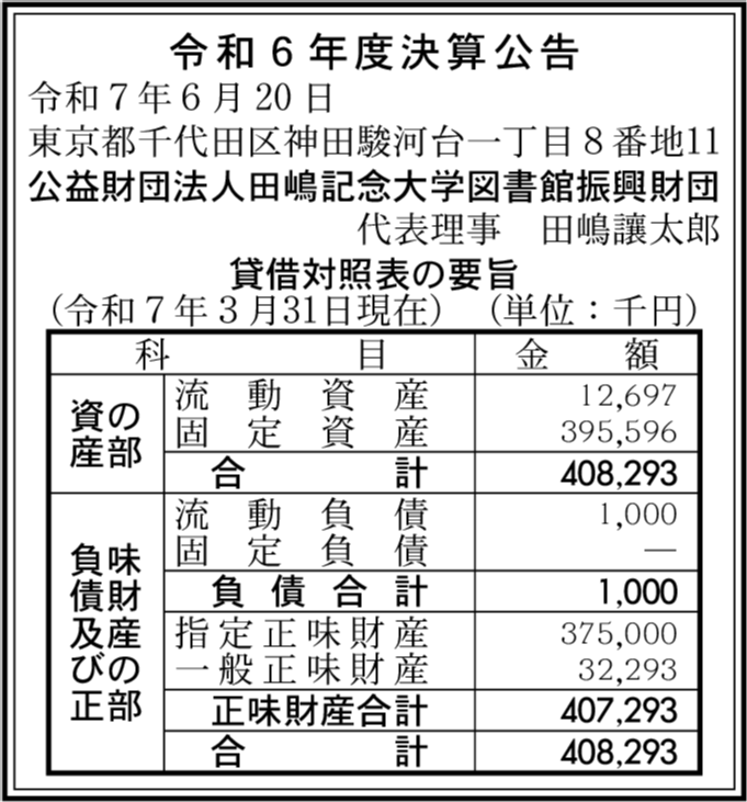 | 会社名 | 公益財団法人田嶋記念大学図書館振興財団 |