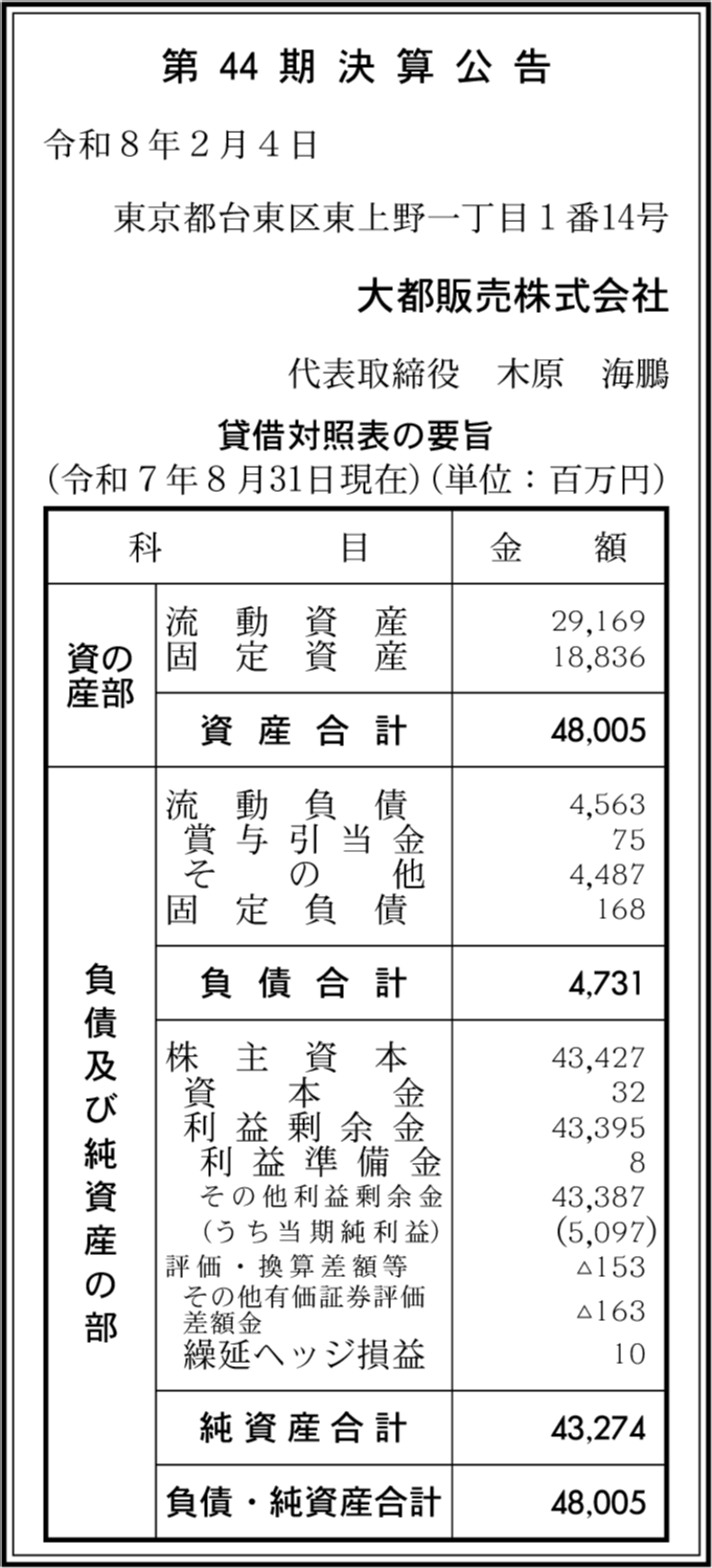株式会社大都販売東京閉鎖済み 東京都台東区 【2024年2月期】 |