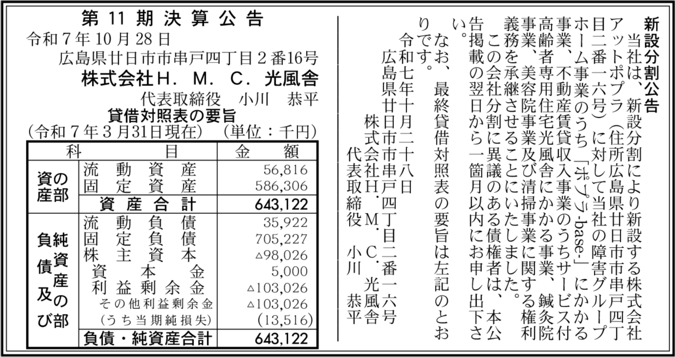 | 会社名 | 株式会社H.M.C.光風舎 |