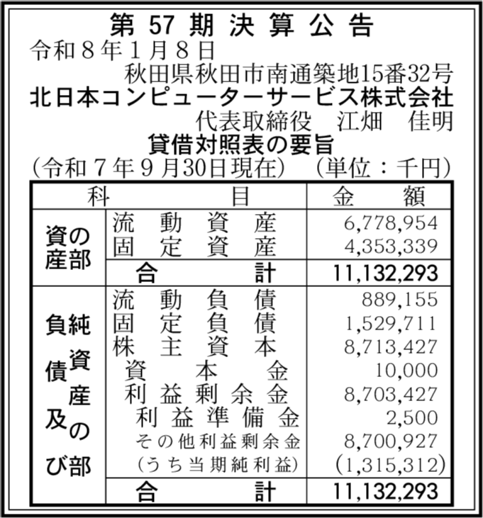| 会社名 | 北日本コンピューターサービス株式会社 |