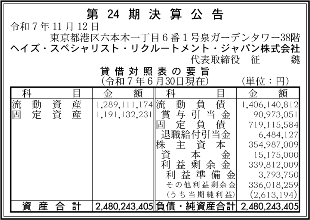 ヘイズ・リソース・マネージメント・ジャパン株式会社 東京都港区 【2025年6月期】 |