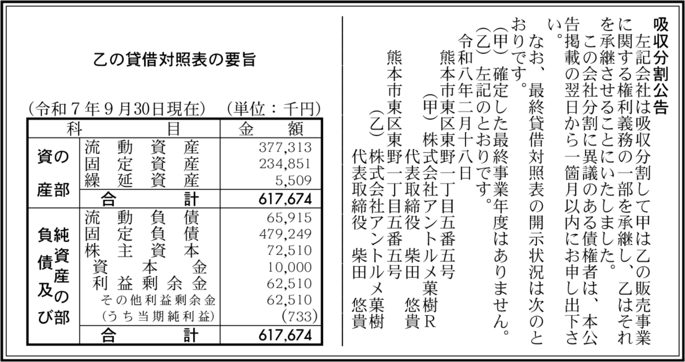 株式会社アントルメ菓樹R 乙の貸借対照表の要旨