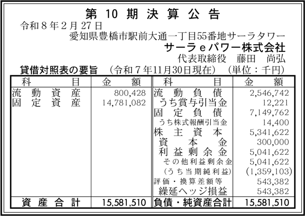 サーラeエナジー株式会社 愛知県豊橋市 【2025年11月期】 |