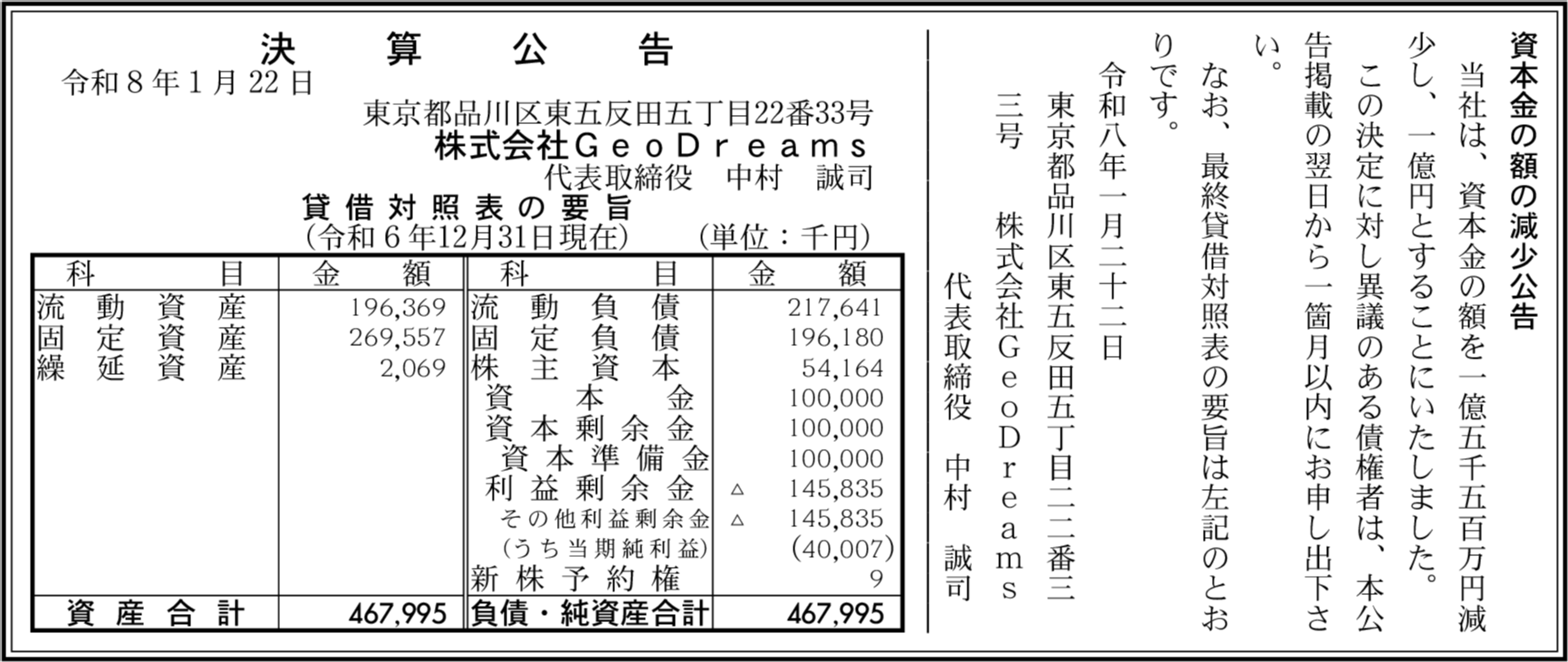 | 利益剰余金 | ▲1億4,583万5,000円 |