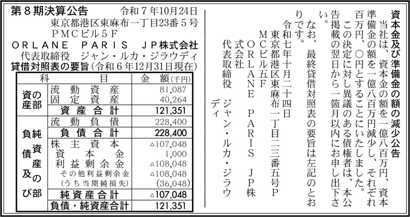 | 会社名 | ORLANE PARIS JP株式会社 |