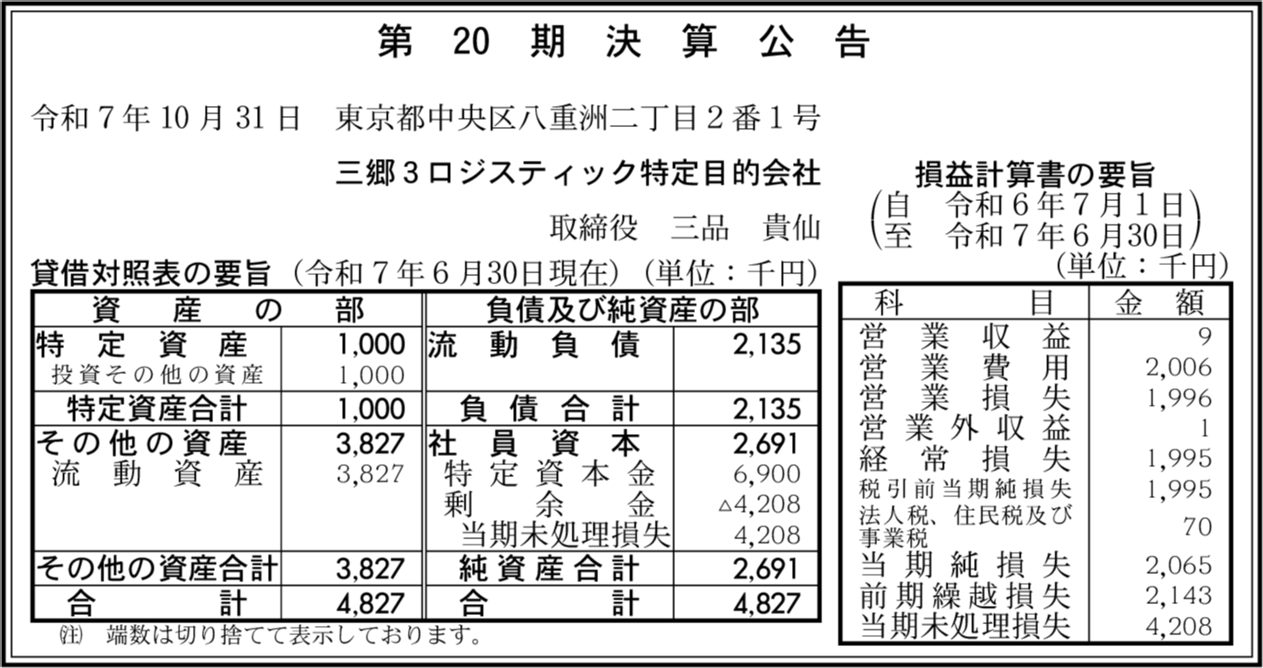 枚方3ロジスティック特定目的会社 東京都中央区 【2025年6月期】 |