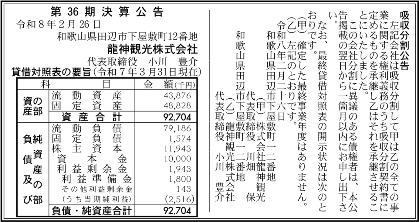 龍神自動車株式会社 和歌山県田辺市 【2025年3月期】 |